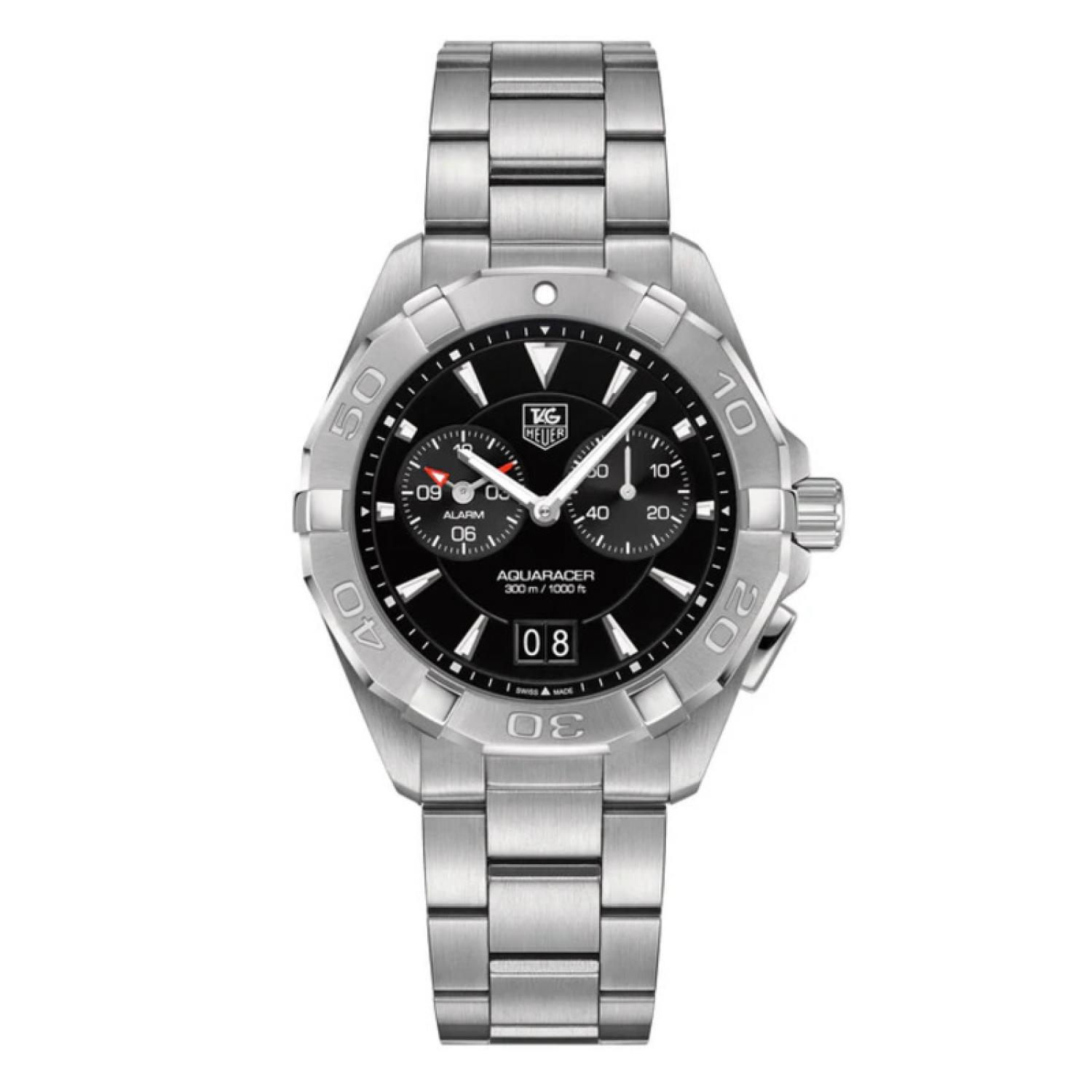 A sleek, quartz-powered watch, perfect for exploring the depths. This one sports a 40.5mm case of tremendously crafted stainless steel. Impervious to water pressure to 300 meters, this Aquaracer is equipped with a steel bezel with oversized numerals. It turns in only one direction for error-free dive timing. Flat anti-reflective sapphire crystal over the dial and dial markers and hands treated with white superluminova® ensure the perfect visibility essential to diving.