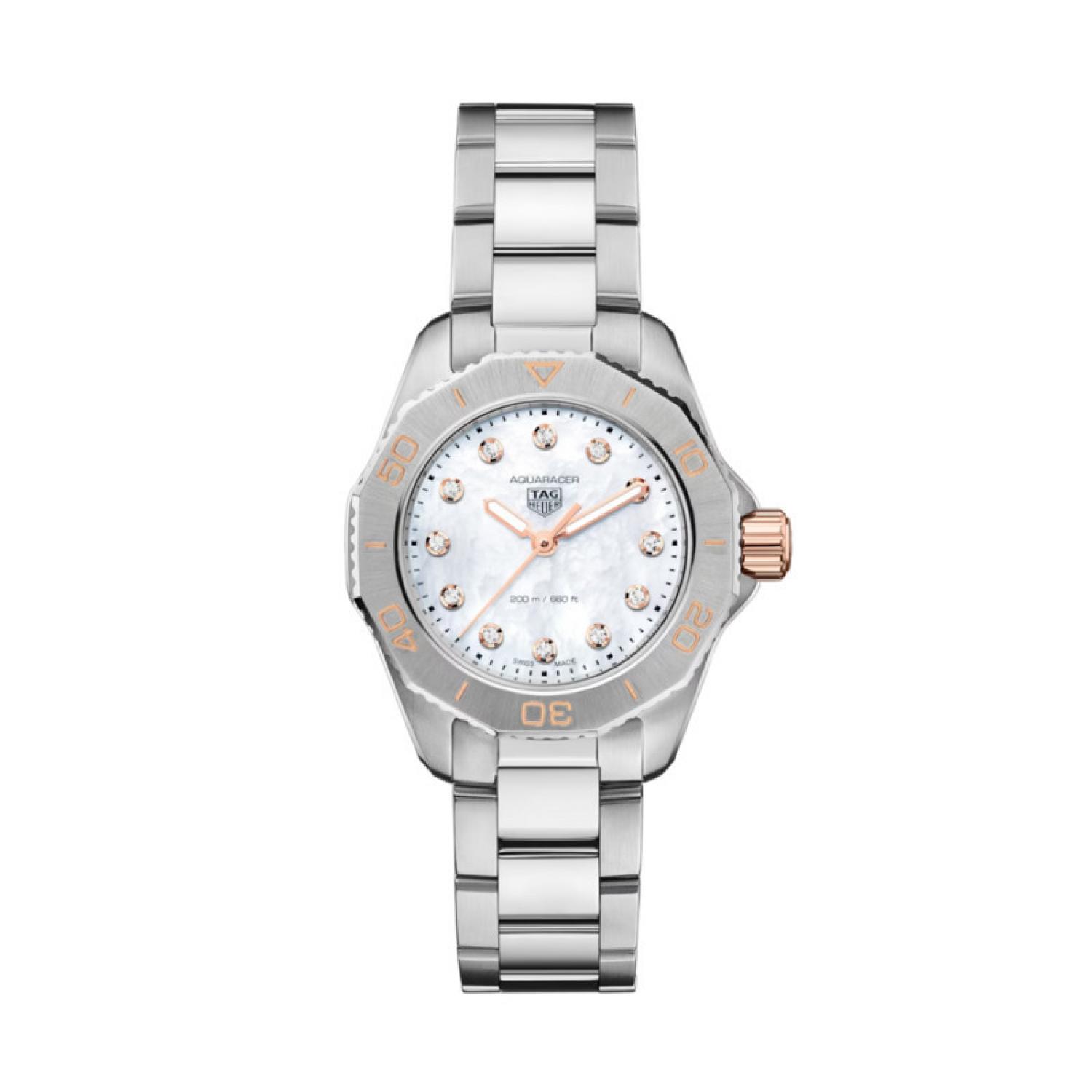Built to last, this 30mm TAG Heuer Aquaracer is equipped with a precise quartz calibre, and the stainless steel case is rated to 200M.
