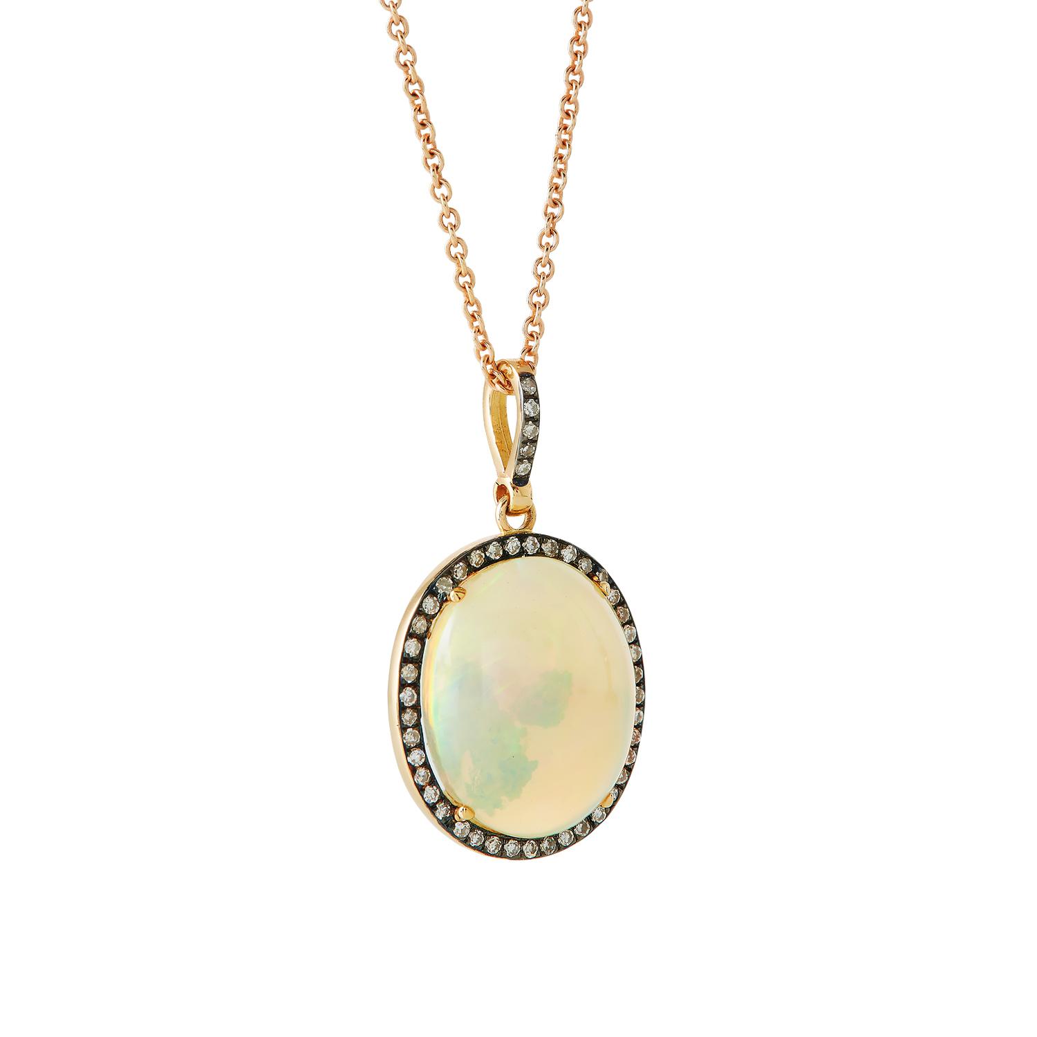 Pendant with an iridescent opal and diamonds on black rodinated gold.