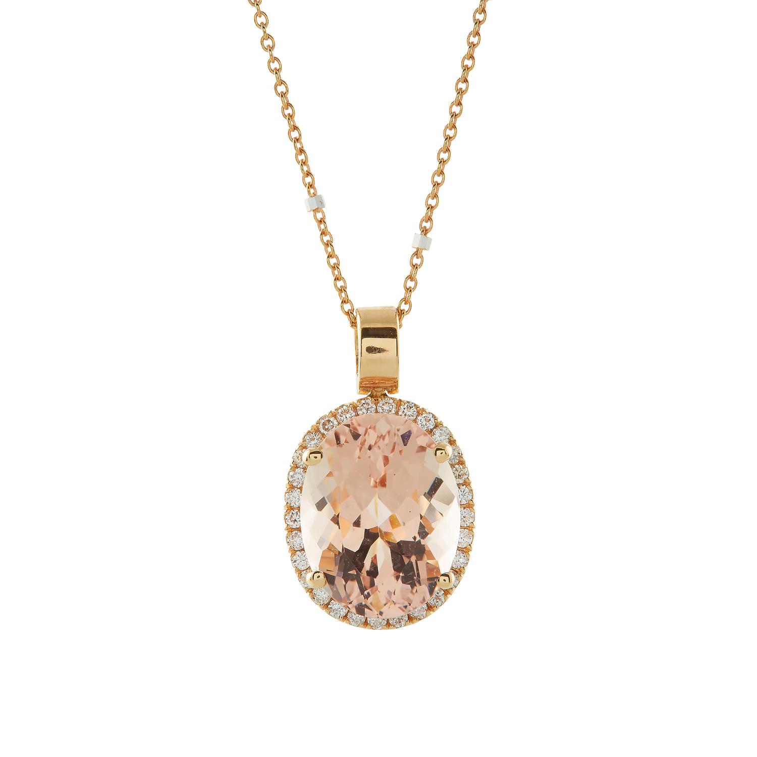 Pendant with pink oval cut morganite and diamonds.