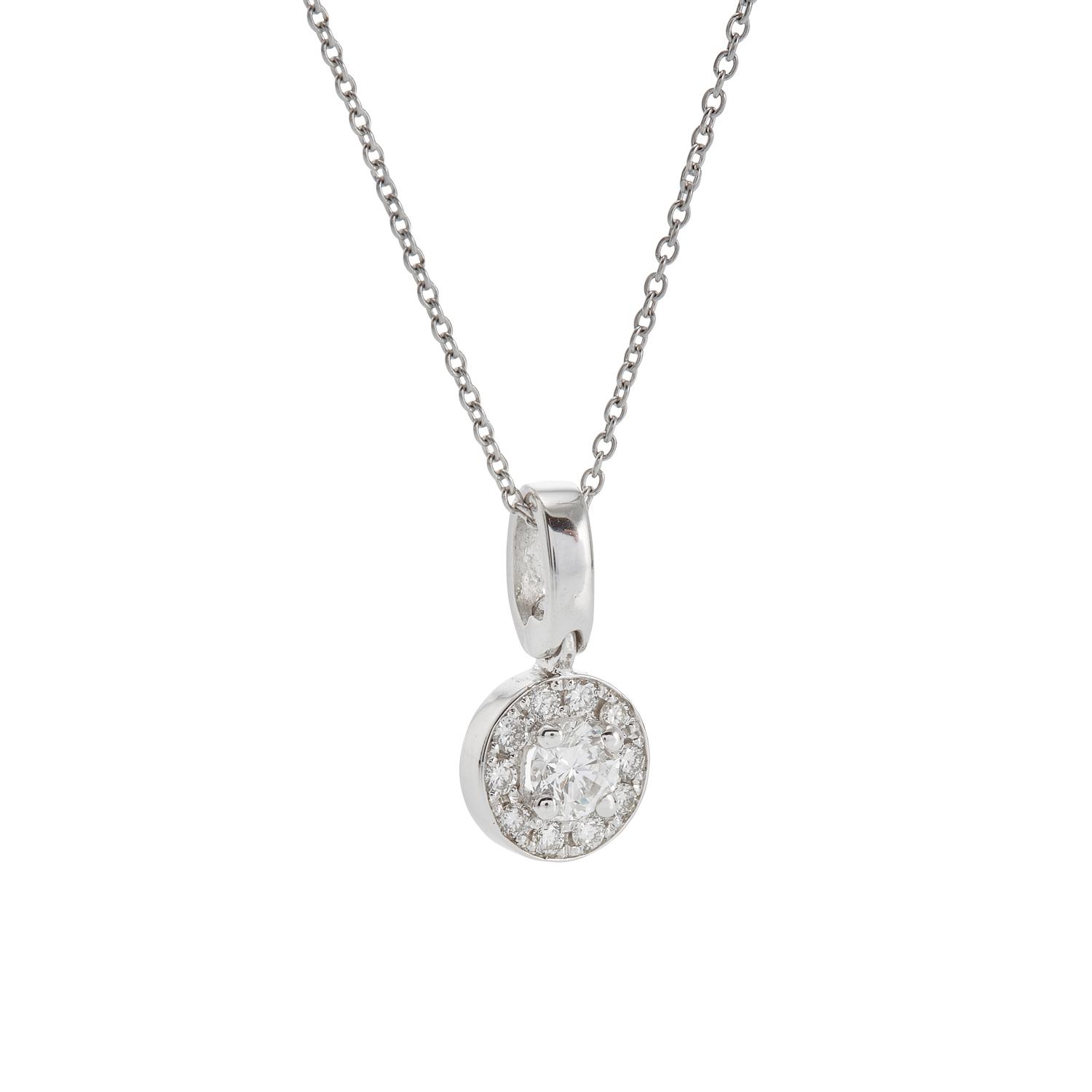 Solitaire Pendant with a superb central stone and a diamond surround.